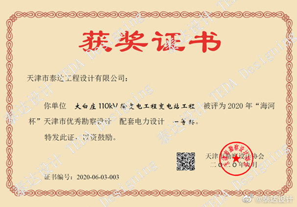 近日,2020年“海河杯”天津市優(yōu)秀勘察設計獎評選結(jié)果揭曉,我公司設計的大白莊110kV輸變電工程變電站工程、大白莊110kV輸變電工程線路工程、天津華電北辰風電園燃氣能源站110kV送出工程、航天五院天津基地項目35kV變電站第一電源線工程等6個項目,分別榮獲天津市優(yōu)秀勘察設計配套電力一等獎兩項、二等獎兩項、三等獎兩項。此次獲獎是公司連續(xù)第五年獲此殊榮。